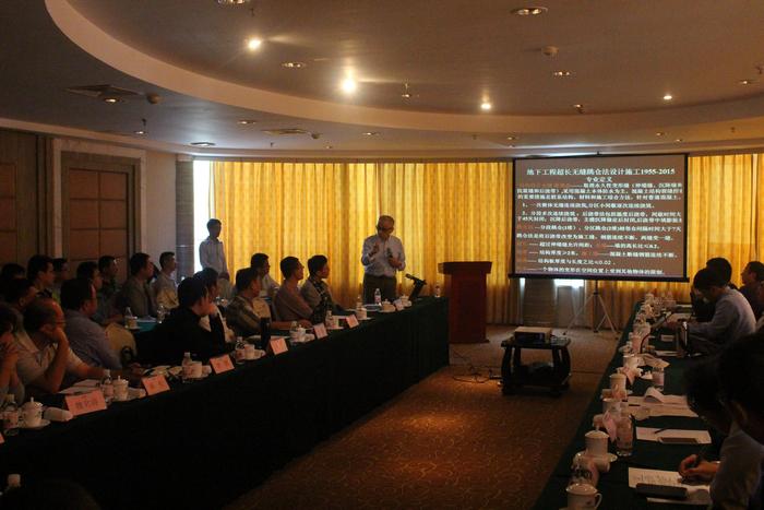 各子集團(tuán)項(xiàng)目部人員就在建工程超長(zhǎng)結(jié)構(gòu)的設(shè)計(jì)與施工情況,及其存在的問(wèn)題做了有針對(duì)性的匯報(bào)。隨后,王鐵夢(mèng)教授對(duì)北京、上海、廣州等地區(qū)正在大量推廣的、效果顯著的“地下工程超長(zhǎng)無(wú)縫跳倉(cāng)法設(shè)計(jì)施工技術(shù)”做了生動(dòng)的介紹,并結(jié)合具體工程案例,對(duì)集團(tuán)在建超長(zhǎng)結(jié)構(gòu)工程中存在問(wèn)題進(jìn)行了詳細(xì)的講解。同時(shí),王鐵夢(mèng)教授還對(duì)集團(tuán)在超長(zhǎng)結(jié)構(gòu)無(wú)縫施工的科研成果和工程應(yīng)用給予了高度的評(píng)價(jià)。最后,與會(huì)人員就超長(zhǎng)結(jié)構(gòu)無(wú)縫施工的相關(guān)問(wèn)題與王鐵夢(mèng)教授進(jìn)行熱烈的研討。