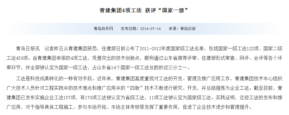 青島日報、青島政務(wù)網(wǎng)、大眾網(wǎng):青建集團(tuán)4項(xiàng)工法 獲評“國家一級”