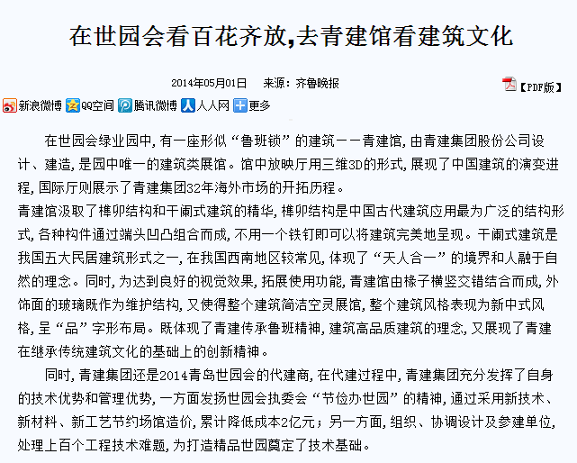 齊魯晚報(bào):《在世園會(huì)看百花齊放,去青建館看建筑文化》