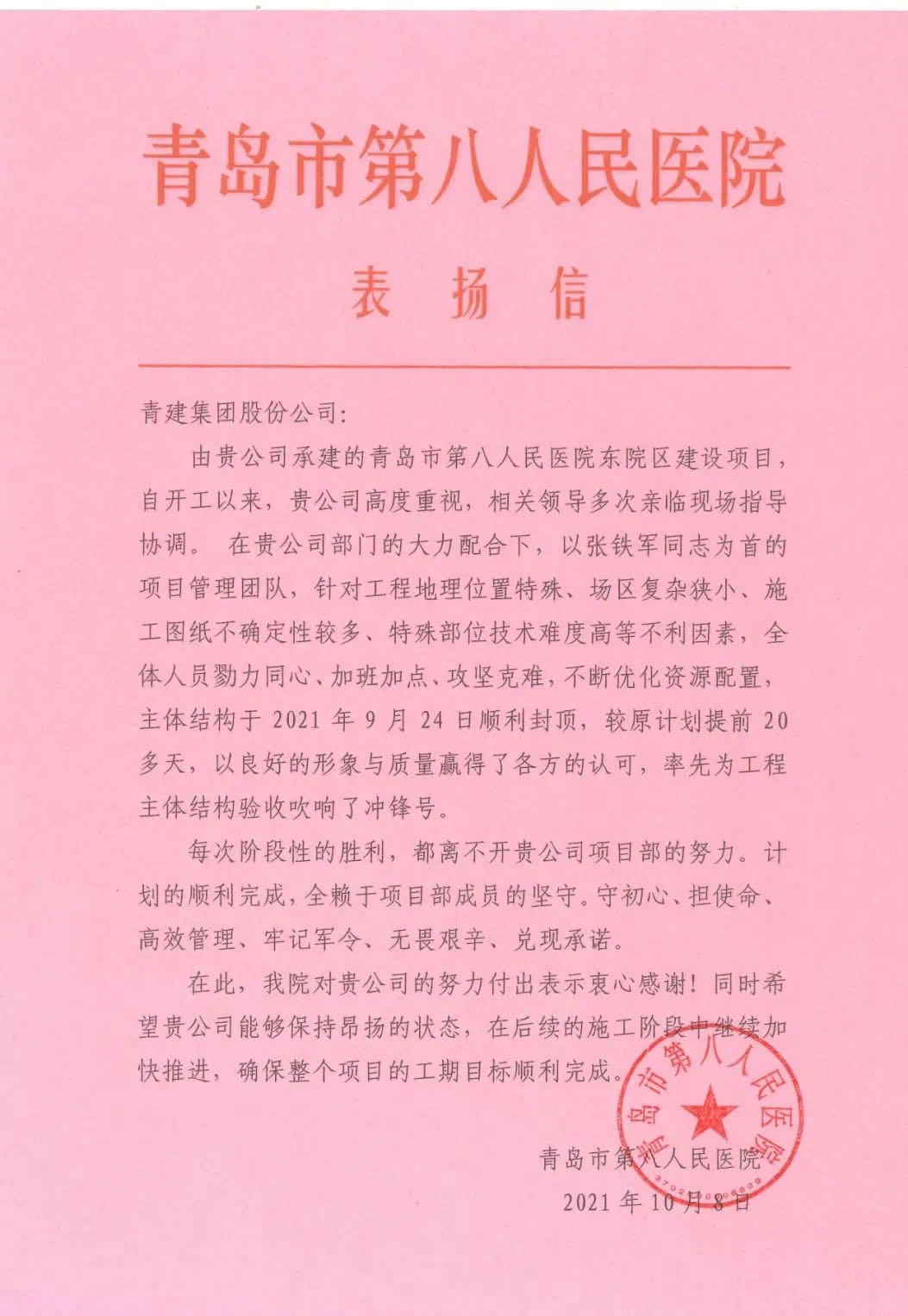 青島市第八人民醫(yī)院向青建集團股份公司發(fā)來表揚信