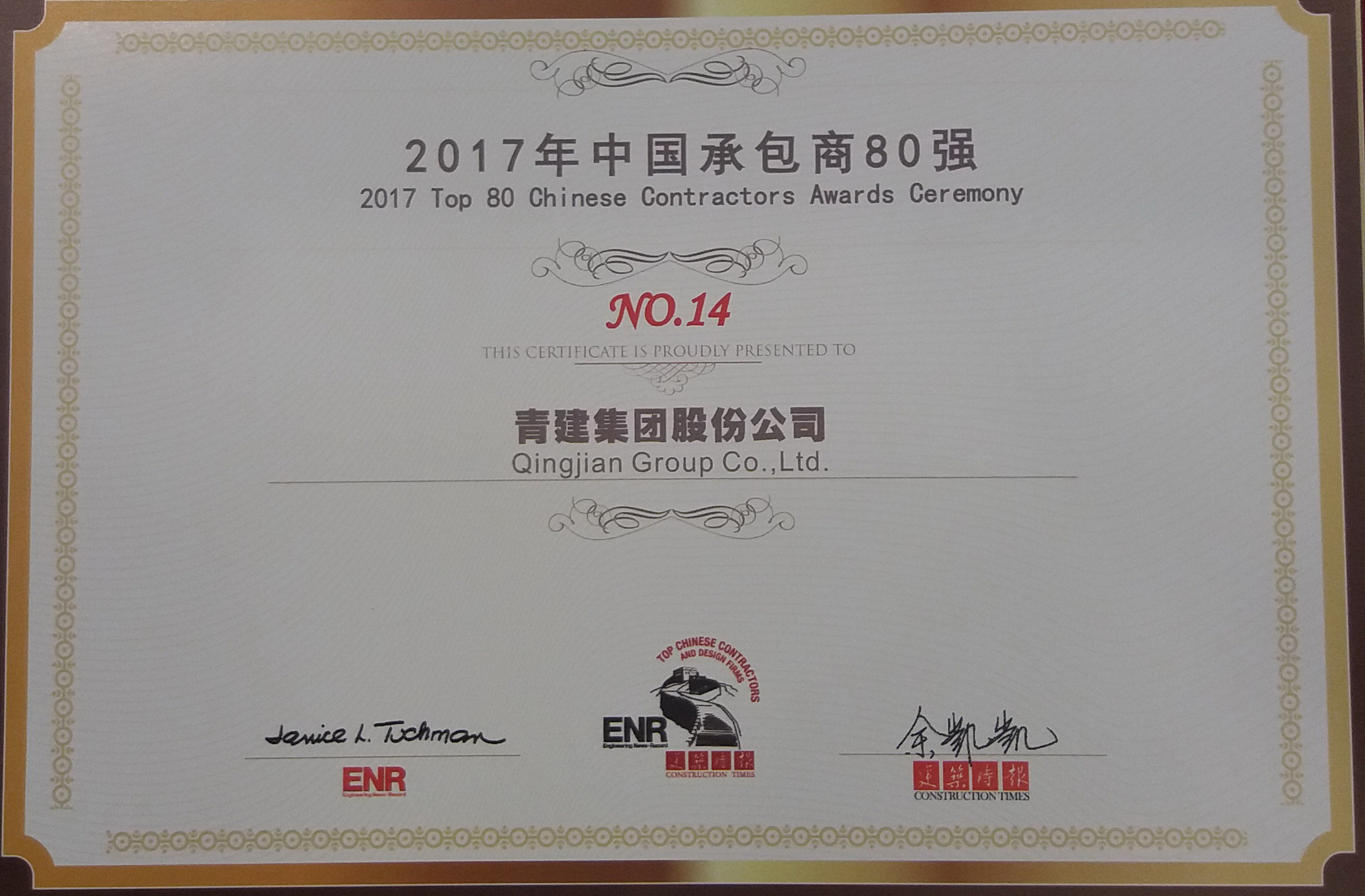 11月30日,美國ENR(Engineering News-Record)《工程新聞紀錄》與中國建筑時報聯(lián)合發(fā)布“2017年中國承包商80強和工程設(shè)計企業(yè)60強”榜單,青建集團股份公司連續(xù)14年入選“中國承包商80強”,2017年位列第14位,同時當選2017最具國際拓展力承包商第4位。在8月份發(fā)布的2017年ENR全球最大250家國際承包商榜單中,青建集團連續(xù)12年上榜,位居第64位,連續(xù)兩年居地方建筑企業(yè)首位。
